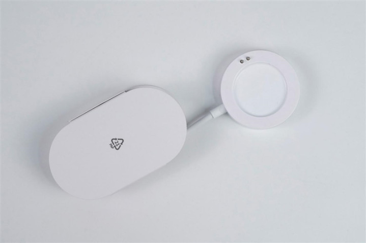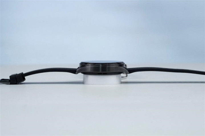 磁吸充电器特写,通过磁吸定位,两个镀金触电自动对齐手表背面的充电触点进行充电,由于手表电池较小,只支持10W充电,所以采用了USB-A的线缆。