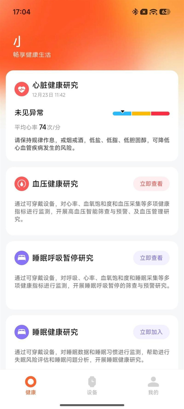 除了ECG专业心电分析之外,小米健康研究APP中还提供了血压健康研究,睡眠健康研究等功能。