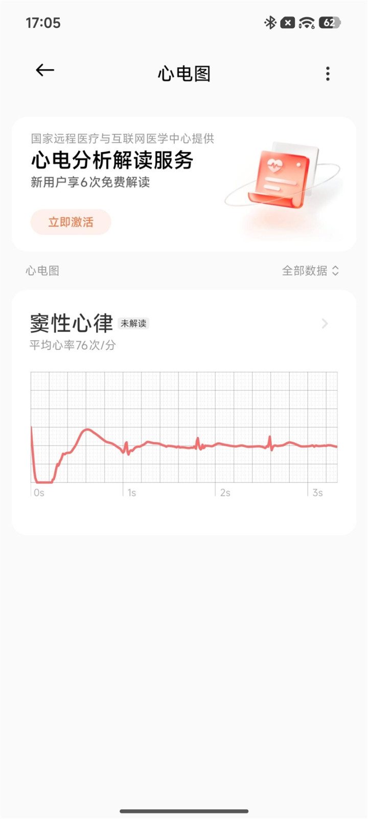在小米运动健康APP中的心电图卡片中,就可以查看本次测量结果,新用户还可以激活6次免费的远程心电分析解读服务,小米运动健康APP和小米手表5会提示用户每天进行一次ECG心电检测,收集更多数据更准备的评估心脏健康。