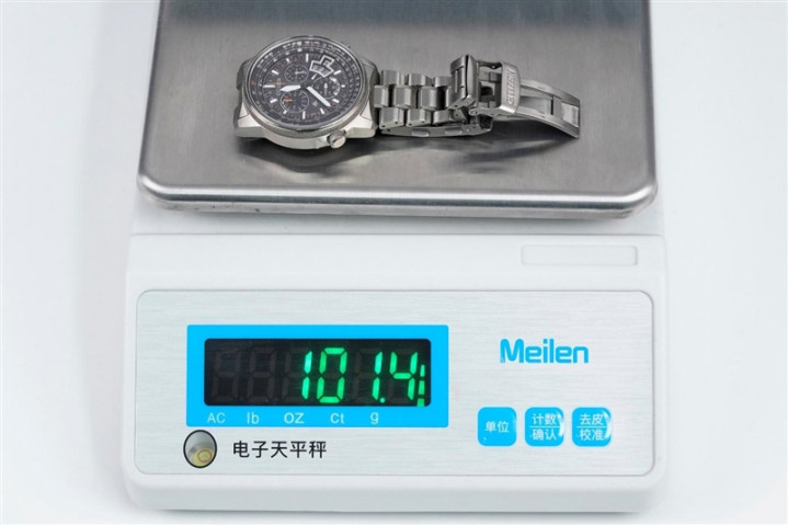 相比我平时戴的表,虽然是全钛合金已经比钢壳表的轻很多,但仍有101.4g重。